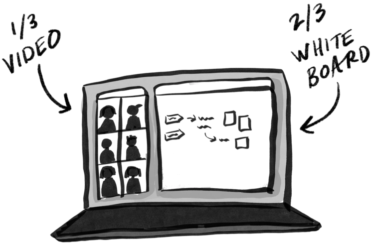 “Help participants set up their workspace like this: ⅓ of the screen should be dedicated for the video call, and ⅔ for the digital whiteboard. This way, everyone feels like they are working as a team and their participation becomes more collaborative and less anonymous.”
