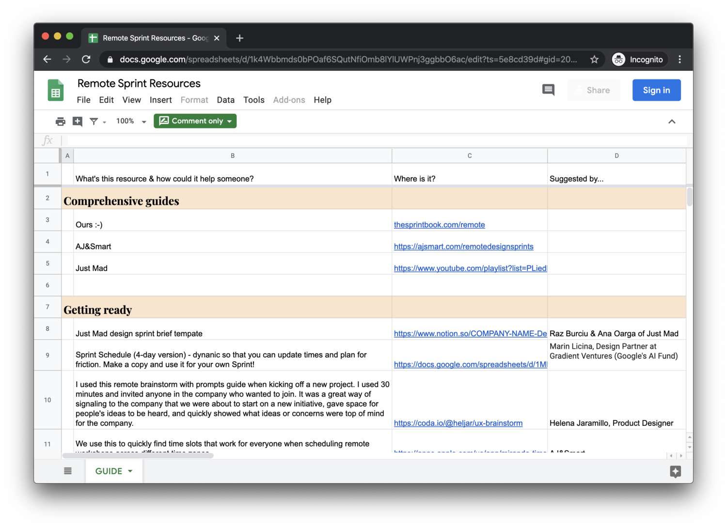 Finally, although we’ve sorted and sifted through everything to give you an opinionated how-to guide, there is a lot more good stuff on remote sprints out there. If you want to go further, you can explore this spreadsheet featuring many of the primary sources we referred to while writing our guide. You’ll find AJ&Smart’s complete guide to remote sprints, Just Mad’s remote sprint video series, a bunch of case studies, and much more.